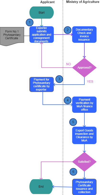 1.1 Exporter or their agent visits Ministry of Agriculture (MoA) permit issuance office to submit application form and consignment documents;